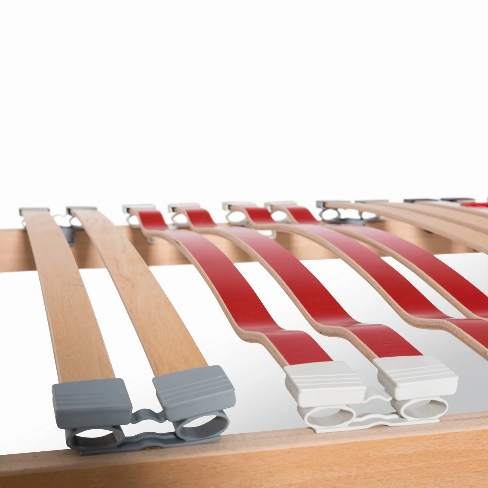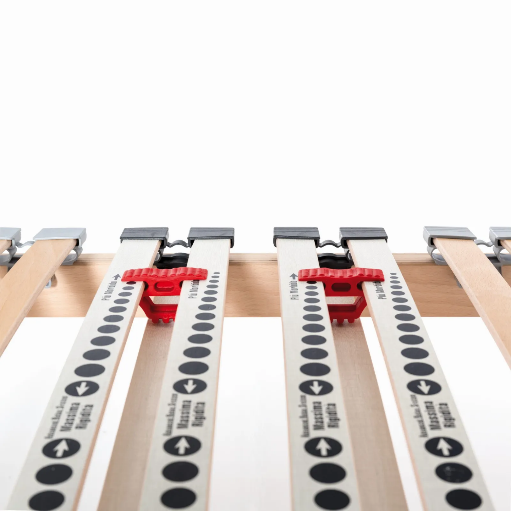 Le doghe ad ala di gabbiano, rivestite con pellicola melaminica rossa, offrono un supporto delicato per le spalle, riducendo la pressione e migliorando la postura. I regolatori di rigidità nella zona bacino consentono di calibrare il sostegno, adattandolo al tuo corpo. Le doghe terminali sagomate assicurano stabilità e comfort ottimali.